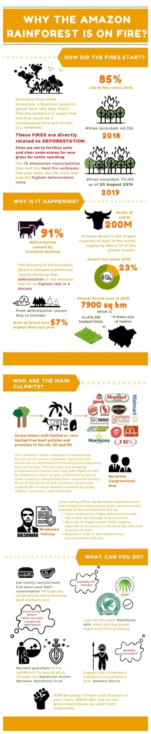 As individuals, consumers and citizens, it is easy to feel powerless about a problem as large as destruction of the Amazon.This infographic not only provides us with valuable information about the extent of the fires and destruction happening right now, but gives us information about who is responsible so we can change what we buy and who we buy from.