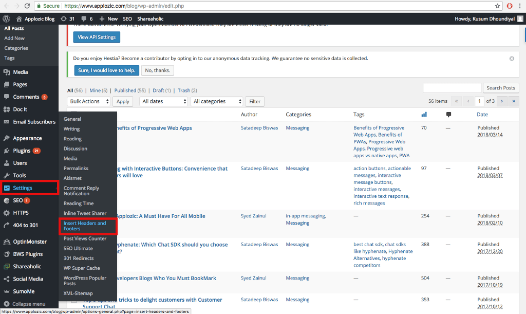 From the left navigation menu, click on “Settings” and select the “Insert Headers and Footers” plugin from the settings submenu.