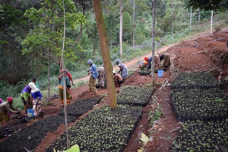 Saplings start life in a nursery growing under the care of nursery staff for 6 to 9 months before they're ready to be planted. 80% of the staff employed in the nurseries are women.