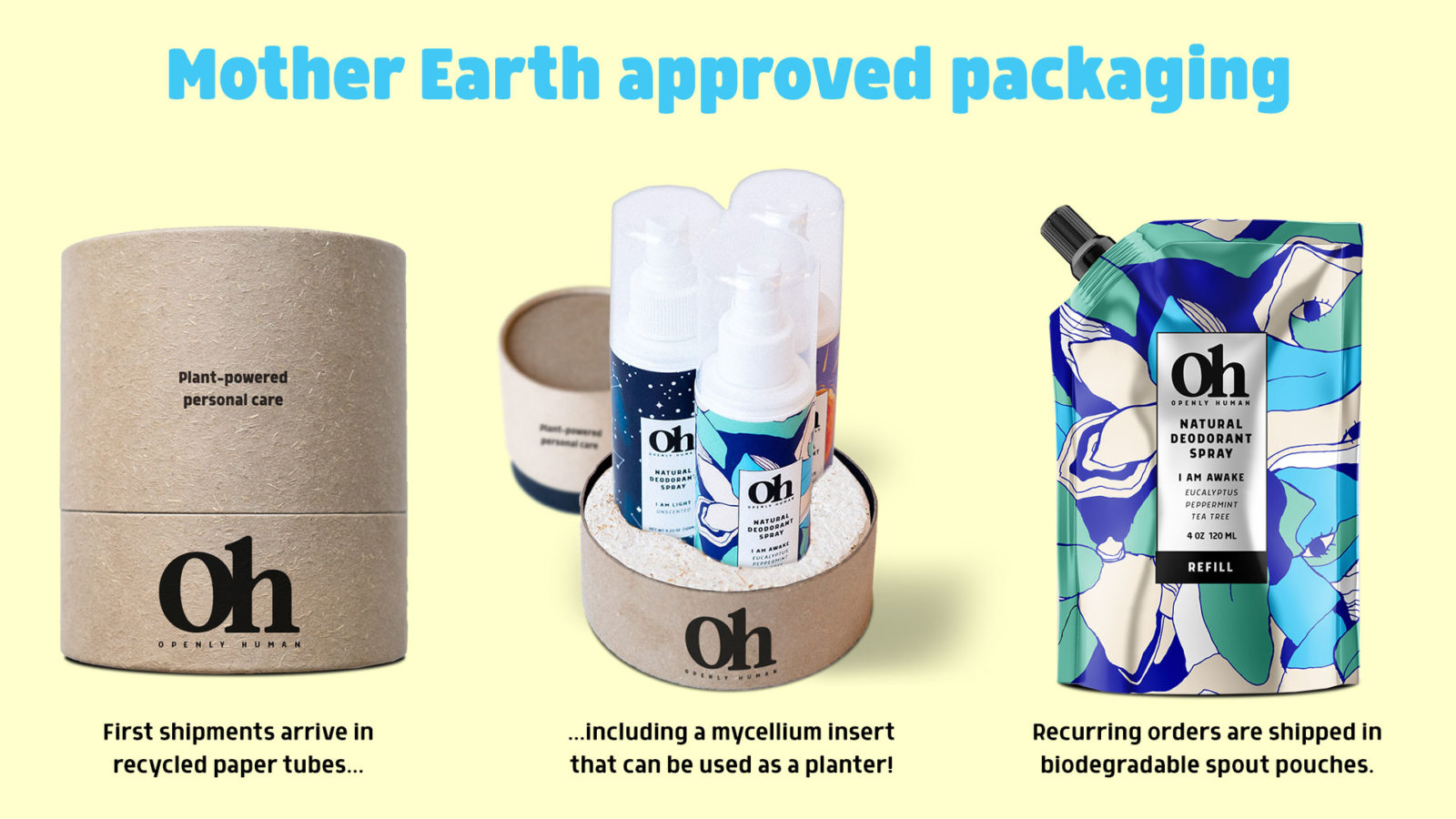We use mushroom-based shipping packaging and sugarcane-based bottles. Our goal is to help reduce one-time use plastics in the personal care industry and make a shift to biopolymers.